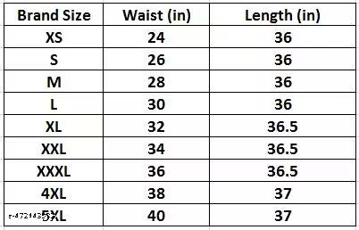 Sizes : XS ( Waist Size : 24 in, Length Size : 36 in), S ( Waist Size : 26 in, Length Size : 36 in), M ( Waist Size : 28 in, Length Size : 36 in), L ( Waist Size : 30 in, Length Size : 36 in), XL ( Waist Size : 32 in, Length Size : 36.5 in), XXL ( Waist Size : 34 in, Length Size : 36.5 in), XXXL ( Waist Size : 36 in, Length Size : 36.5 in), 4XL ( Waist Size : 38 in, Length Size : 37 in), 5XL ( Waist Size : 40 in, Length Size : 37 in)