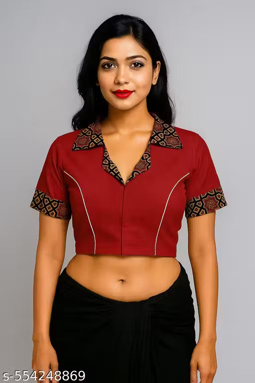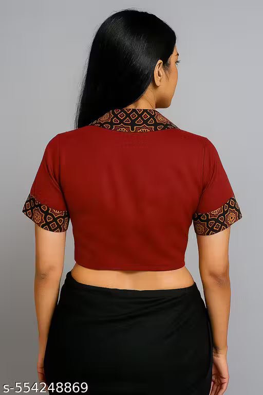 Trendy Maroon Cotton Blouse with Ajrak Print Collar & Sleeves | Short Sleeve Crop Style Readymade Saree Blouse | Stylish Party Wear & Daily Wear Blouse